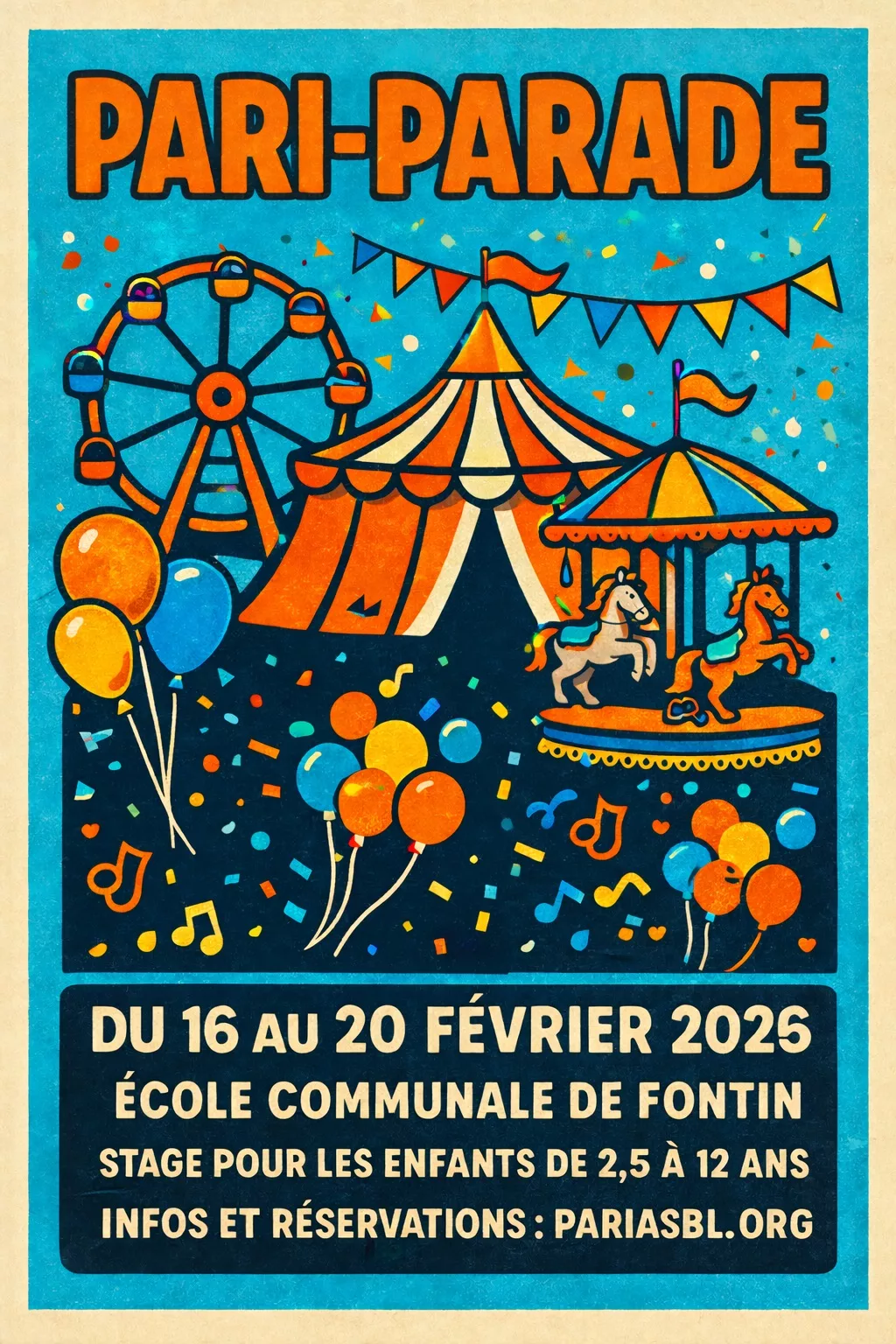 PARI-PARADE : En piste pour la fête ! Retrouvons-nous pour une semaine explosive de couleurs, de rythmes et de magie ! Plongeons dans l’univers fascinant des carnavals et laissons notre imagination s’envoler : ensemble, nous créerons des costumes extraordinaires et donnerons vie à des personnages fantastiques. Musique, danse et créativité seront au rendez-vous pour préparer la grande parade finale. Prêts à défiler ? Le public n’attend que nous !